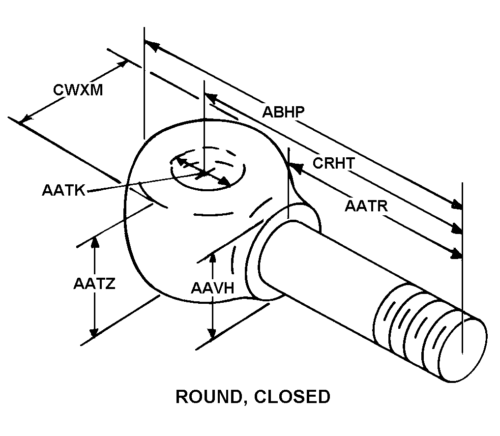 5306-01-487-7460 An externally threaded device whose threaded portion is of one nominal diameter, without a head, but with the unthreaded end either bent more than 225 degrees (3.925 radians) or cast, forged, or punched to resemble an eye. See also BOLT, HOOK. Excludes CONNECTOR, ROD END.