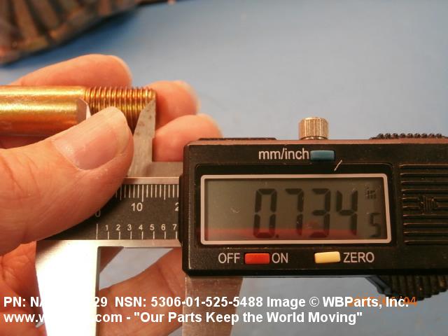 5306-01-525-5488 An externally threaded fastener whose unthreaded portion is of a specified grip length, plated or unplated, and is machined to a tolerance of one thousandth (0.001) of an inch (0.025 mm) or less of a specific diameter for items one inch (25 mm) or less in diameter. Items over one inch (25 mm) in diameter shall have a tolerance of fifteen ten-thousandths (0.0015) of an inch (0.038 mm) or less. The nominal major diameter of the threads shall be at least one thousandth (0.001) of an inch (0.025 mm) below the minimum shank diameter, but not below the minimum major diameter for applicable class of fit, as shown in the Screw Thread Standards, FED STD H28 and/or other nationally recognized standards. The head is not designed to be held or driven with an inserted driver, nor is it designed for rotation by the thumb and fingers. A locking feature may be incorporated in the design of the head or threads. For items having close tolerance, and fabricated from material having 160,000 pounds per square inch (1100 megapascals) minimum tensile strength, see BOLT, SHEAR. For items fabricated from material having less than 160,000 pounds per square inch (1100 megapascals) minimum tensile strength and not having a close tolerance, see BOLT, MACHINE.