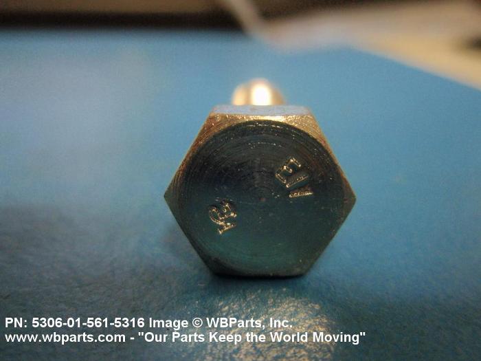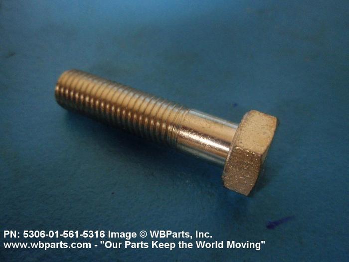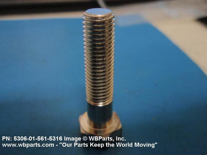 5306-01-561-5316 An externally threaded fastener designed for insertion through holes in assembled parts and normally intended to be tightened or released by torquing a nut. The threaded and unthreaded portions are both of one nominal diameter of 0.190 inch (5 mm) or larger. The head is not designed to be held or driven with an inserted driver or by the thumb and fingers. A locking feature may be incorporated in the design of the head or threads. Head dimensions and sizes of threaded and unthreaded portions shall conform to internationally recognized fastener standards. For items having a grip length portion machined to a tolerance of 0.0015 inch (0.038 mm) or less, BOLT, SHEAR. See also SCREW, CAP, HEXAGON HEAD and SCREW, MACHINE.