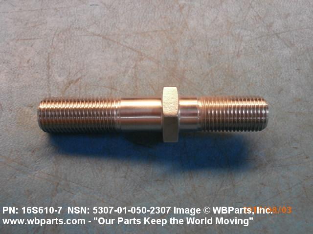 5307-01-050-2307 A headless fastener not exceeding 12 inches (304.8 mm) in length, threaded externally on both ends with threads of the same nominal diameter. All or part of the unthreaded section has a cross-sectional diameter greater than the nominal stud size plus 0.020 inches (0.508 mm). It may be thread relieved. See also STUD, LOCKED IN.