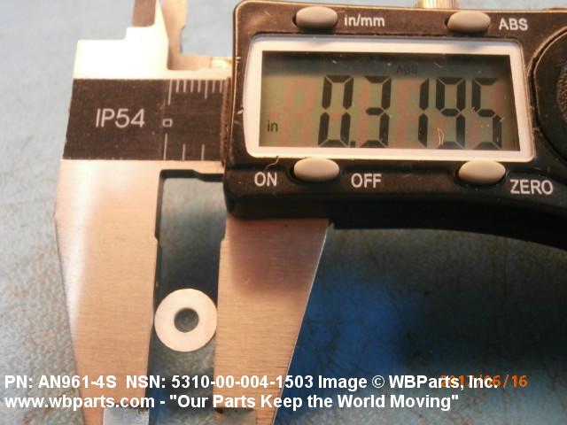5310-00-004-1503 A washer having a centrally located hole with a solid or laminated cross-section and two flat parallel bearing surfaces. The hole must be 75 percent or less than the largest dimension and the bearing surface finish is greater than 32 microinch (0.8 micrometer). The thickness cannot exceed 25 percent of the largest outside dimension. When the largest outside dimension is less than 1/4 inch or 6mm, the thickness must be 0.006 inches (0.15mm) or greater and for items 1/4 inch (6mm) or larger, the thickness must be 0.016 inches (0.4mm) or greater. The maximum tolerance is applied to dimensions and used as a determining factor. Items with separable lamination use SHIM. For items fabricated from ceramic or electrically rated materials by specification or industry standards use INSULATOR (1), WASHER. Excludes DISK, VALVE, graphite impregnated and lubricated items.