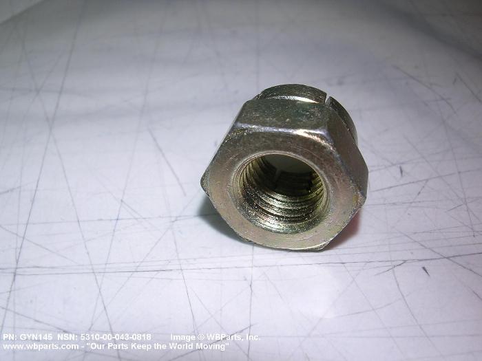 5310-00-043-0818 A nut having a flat bearing surface and 6 flat sides with slots in its upper portion. An integral feature is incorporated for locking on the threads of a mating member. The slots, when used in conjunction with a solid or split (cotter) pin, act as an extra "fail safe", feature in critical applications. Excludes NUT (1), SELF-LOCKING, CASTELLATED, OCTAGON.