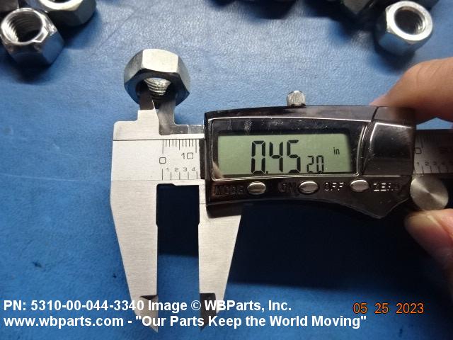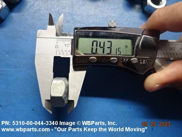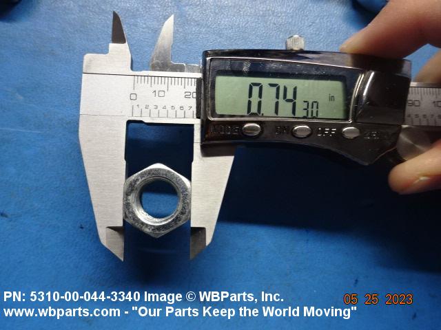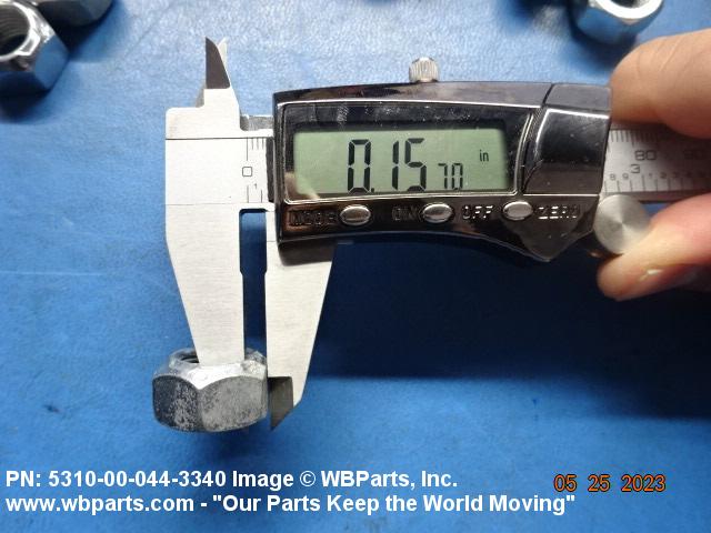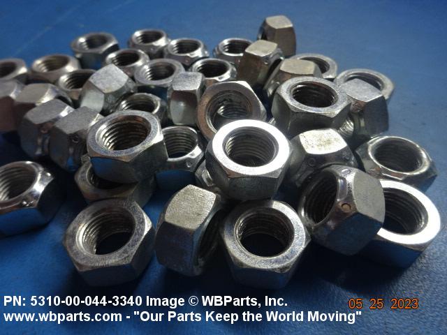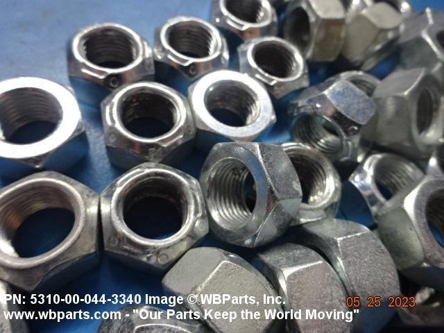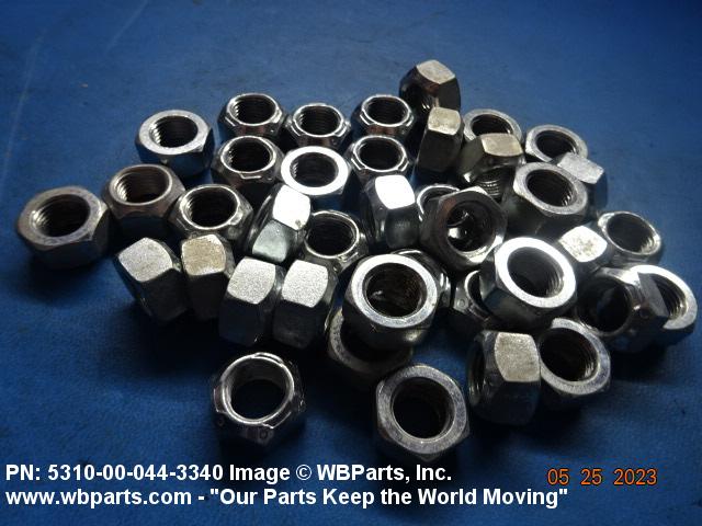 5310-00-044-3340 A nut having a flat bottom and 6 sides. An integral feature is incorporated for locking on the threads of a mating member. Excludes NUT (1), SELF-LOCKING, CAP.