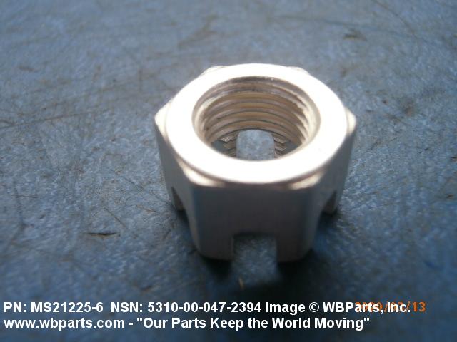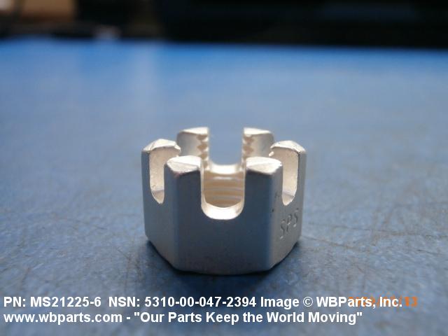 5310-00-047-2394 A nut having a flat bearing surface and 6 flat sides with slots in its upper portion. An integral feature is incorporated for locking on the threads of a mating member. The slots, when used in conjunction with a solid or split (cotter) pin, act as an extra "fail safe", feature in critical applications. Excludes NUT (1), SELF-LOCKING, CASTELLATED, OCTAGON.