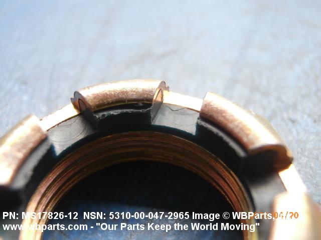 5310-00-047-2965 A nut having a flat bearing surface and 6 flat sides with slots in its upper portion. An integral feature is incorporated for locking on the threads of a mating member. The slots, when used in conjunction with a solid or split (cotter) pin, act as an extra "fail safe", feature in critical applications. Excludes NUT (1), SELF-LOCKING, CASTELLATED, OCTAGON.