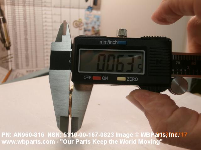5310-00-167-0823 A washer having a centrally located hole with a solid or laminated cross-section and two flat parallel bearing surfaces. The hole must be 75 percent or less than the largest dimension and the bearing surface finish is greater than 32 microinch (0.8 micrometer). The thickness cannot exceed 25 percent of the largest outside dimension. When the largest outside dimension is less than 1/4 inch or 6mm, the thickness must be 0.006 inches (0.15mm) or greater and for items 1/4 inch (6mm) or larger, the thickness must be 0.016 inches (0.4mm) or greater. The maximum tolerance is applied to dimensions and used as a determining factor. Items with separable lamination use SHIM. For items fabricated from ceramic or electrically rated materials by specification or industry standards use INSULATOR (1), WASHER. Excludes DISK, VALVE, graphite impregnated and lubricated items.