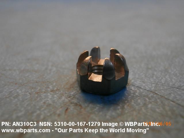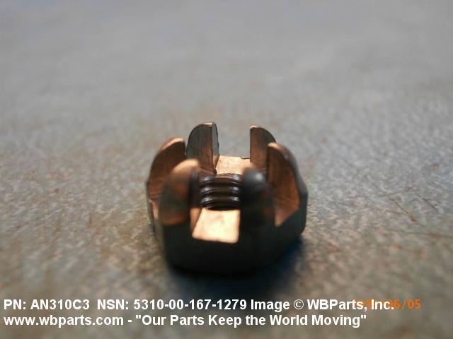 5310-00-167-1279 A nut having 6 flat sides, flat on the bottom and having a slotted cylindrical or dome shaped upper portion. It is designed to provide positive locking when used with a solid or split (cotter) pin. Excludes NUT (1), PLAIN, SLOTTED, HEXAGON.