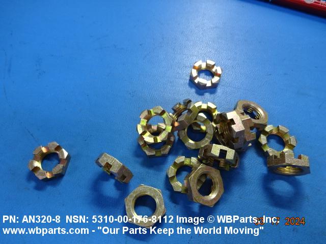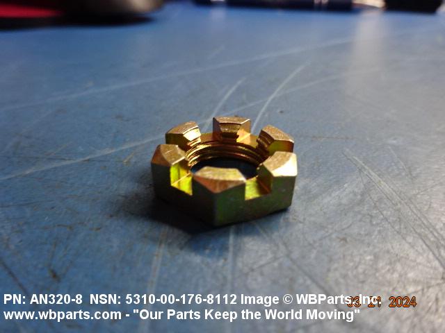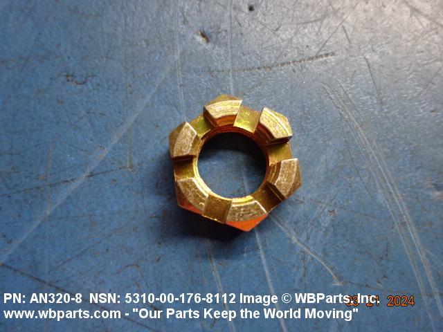 5310-00-176-8112 A nut having a flat bearing surface and 6 flat sides with slots in its upper portion. It is designed to provide positive locking when used with a solid or split (cotter) pin. Excludes NUT (1), PLAIN, CASTELLATED, HEXAGON.