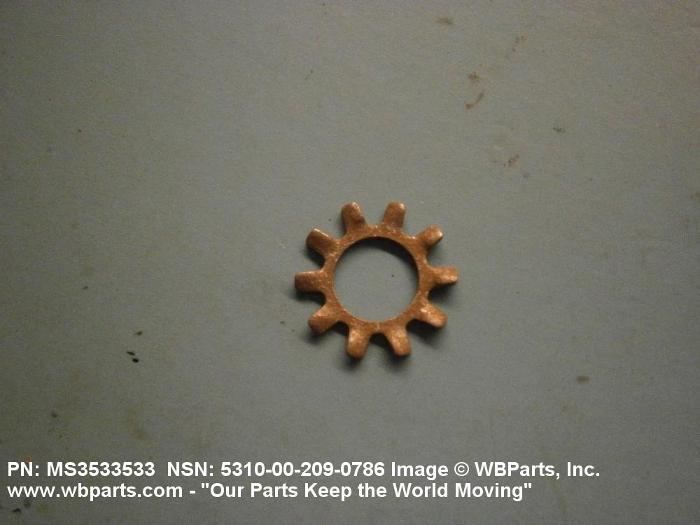 5310-00-209-0786 A washer which is usually round with a centrally located hole. Its edges and two bearing surfaces are so designed that applied pressure brings into play the spring tension and/or frictional locking principle which materially resists any tendency toward turning. It may be made of one or two pieces
