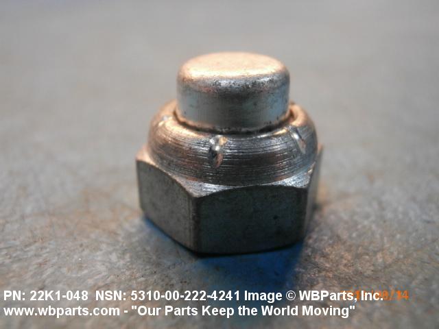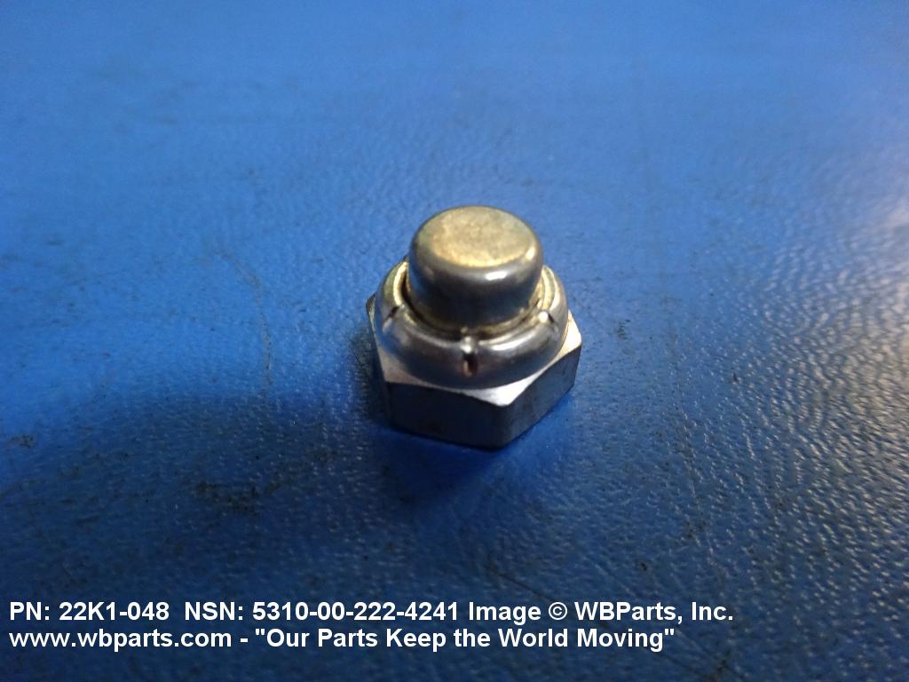 5310-00-222-4241 A nut internally threaded from one end, and completely enclosed on the opposite end. The outer periphery parallel to the threaded axis may be square, cylindrical, hexagonal, octagonal, dodecagonal or the like and taper to a cone or dome shape on the closed end. An integral feature is incorporated for locking on the threads of a mating memeber. Excludes NUT (1), STAMPED.