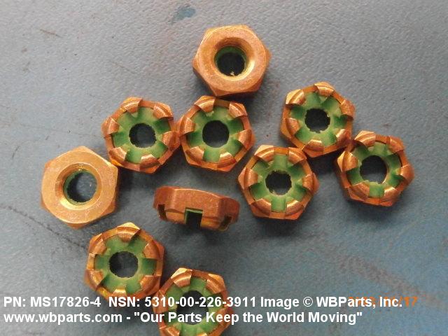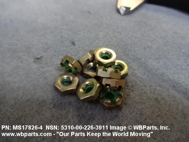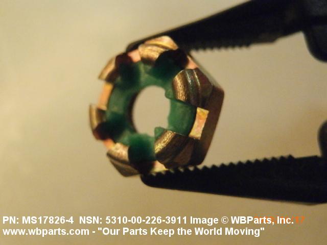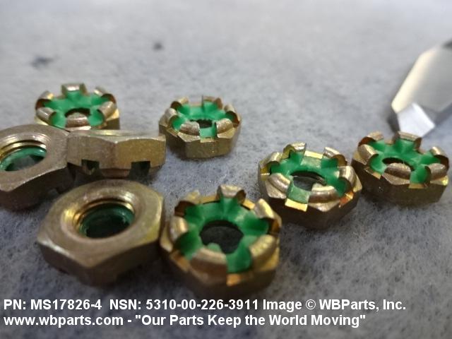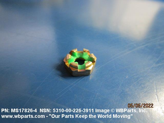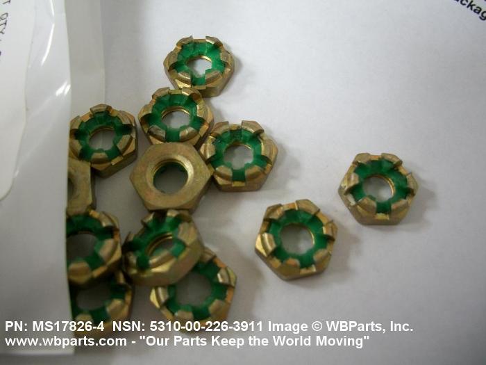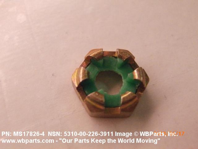 5310-00-226-3911 A nut having a flat bearing surface and 6 flat sides with slots in its upper portion. An integral feature is incorporated for locking on the threads of a mating member. The slots, when used in conjunction with a solid or split (cotter) pin, act as an extra "fail safe", feature in critical applications. Excludes NUT (1), SELF-LOCKING, CASTELLATED, OCTAGON.