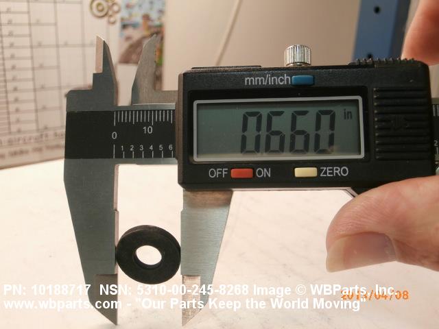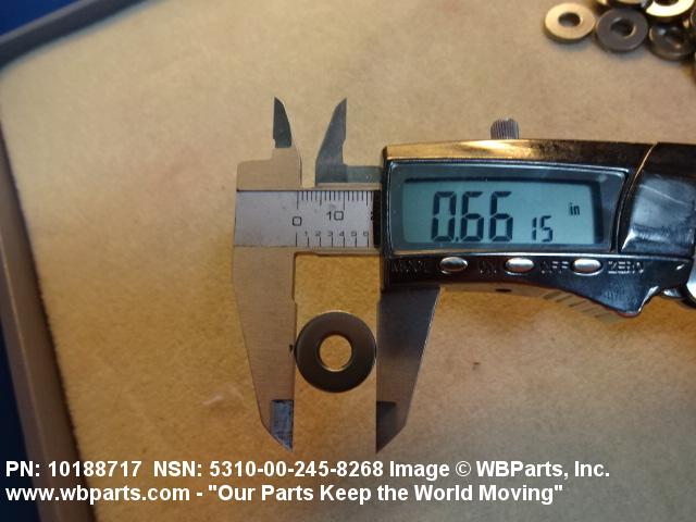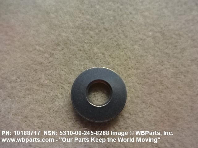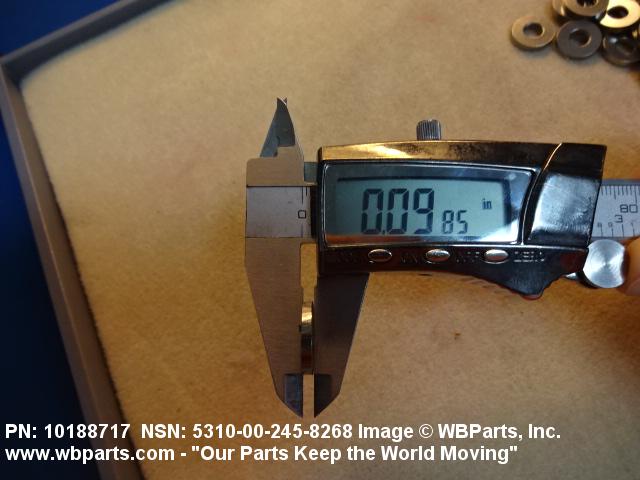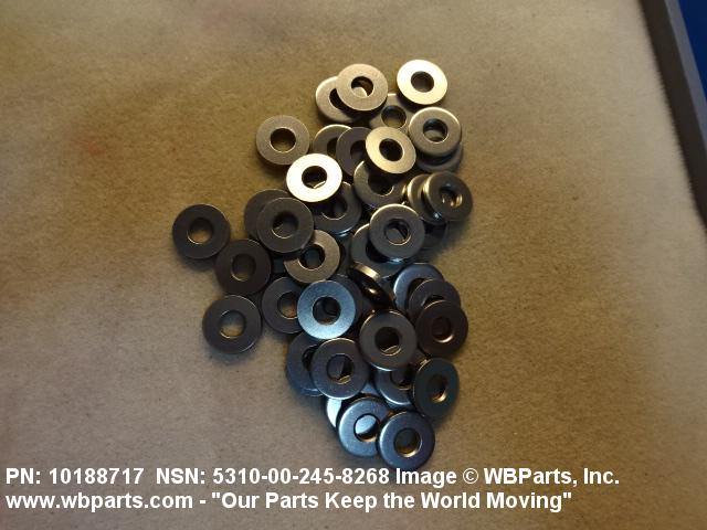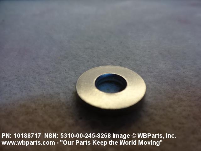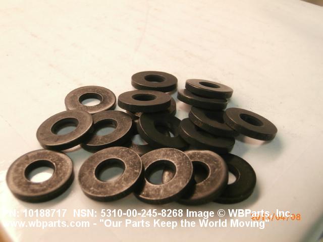 5310-00-245-8268 A washer of any peripheral shape having a centrally located hole. Both bearing surfaces are parallel and flat, but one or both of the bearing surfaces must be broken by a counterbore, countersink, or similarly shaped recess. The thickness must not exceed 25 per cent of the outside diameter or the largest outside dimension. The maximum limit of the tolerance or range applied to the thickness and/or largest outside dimension must be used to determine compliance. Excludes WASHER, CONCAVE, RETAINER, PACKING, and thrust type washers. See also SPACER, SLEEVE; and SPACER, STEPPED.