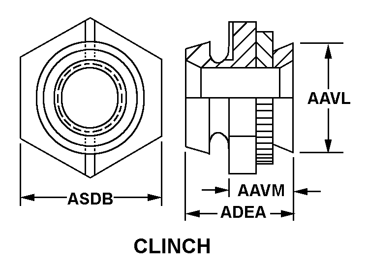 5310-00-255-5402 A nut having a sleeve portion on its under side, which can be crimped or clinched to hold the item in place when inserted in a hole. An integral feature is incorporated for locking.