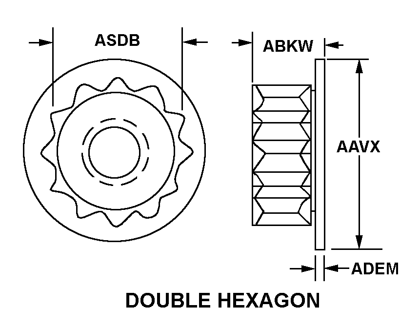 5310-00-345-2021 A nut having 12 drive points, 24 sides, and an integral washer which extends beyond the points or periphery. An integral feature is incorporated for locking on the threads of a mating member.