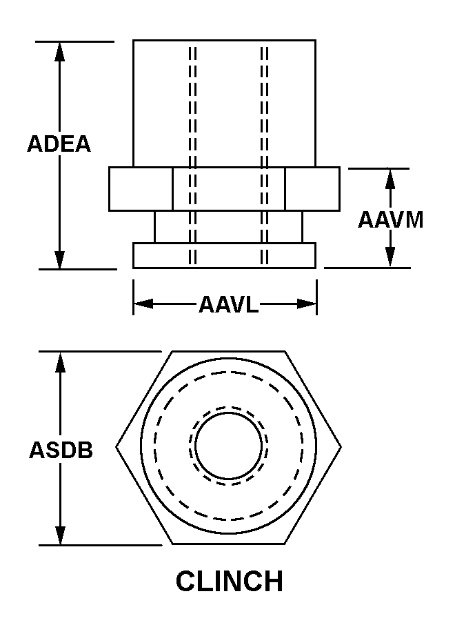 5310-00-413-0059 A nut having a sleeve portion on its under side, which can be crimped or clinched to hold the item in place when inserted in a hole. An integral feature is incorporated for locking.