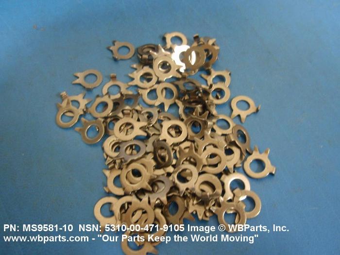 5310-00-471-9105 A washer of nonresilient material usually having two parallel bearing surfaces. The outside and/or inside edges have one or more protuberances. The ends and/or edges may be prebent at any angle or the protuberances may be prebent at any angle to the bearing surfaces. The keys or lugs may be fitted into keyways in adjacent material or they may be bent over after application to hold or lock one or more items in place. Excludes thrust type washer.