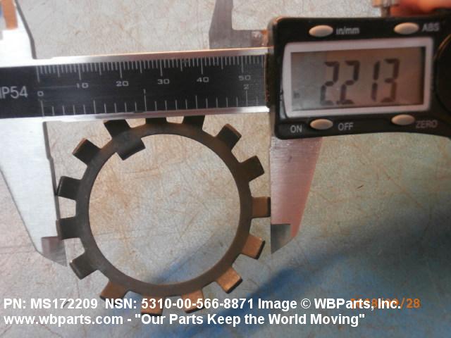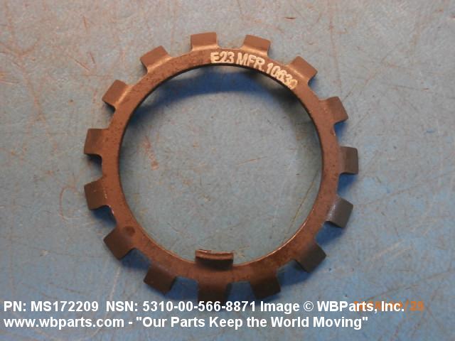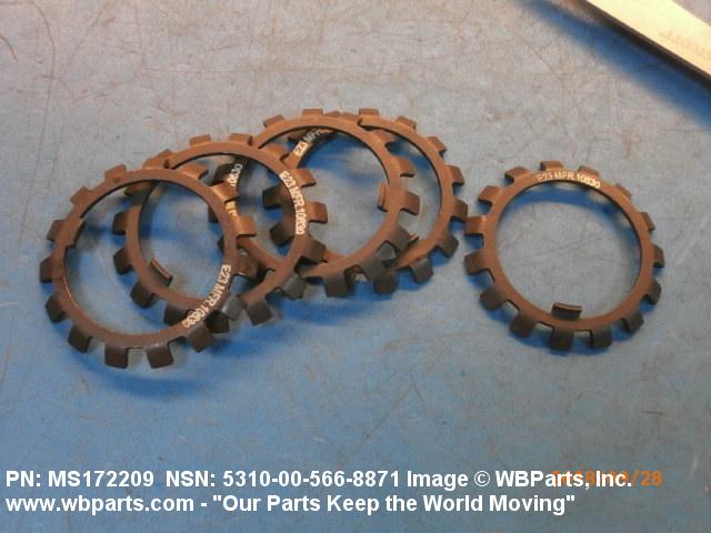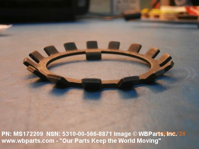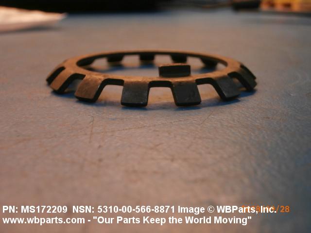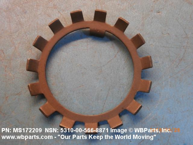 5310-00-566-8871 A washer of nonresilient material usually having two parallel bearing surfaces. The outside and/or inside edges have one or more protuberances. The ends and/or edges may be prebent at any angle or the protuberances may be prebent at any angle to the bearing surfaces. The keys or lugs may be fitted into keyways in adjacent material or they may be bent over after application to hold or lock one or more items in place. Excludes thrust type washer.