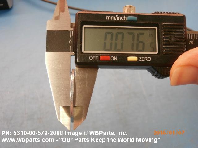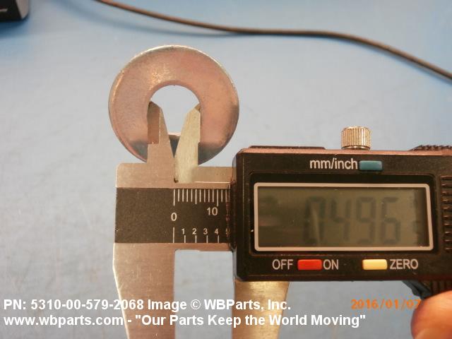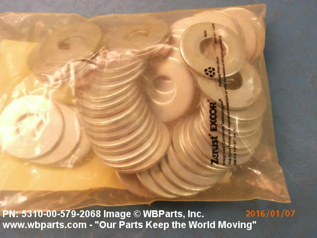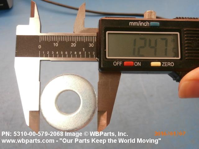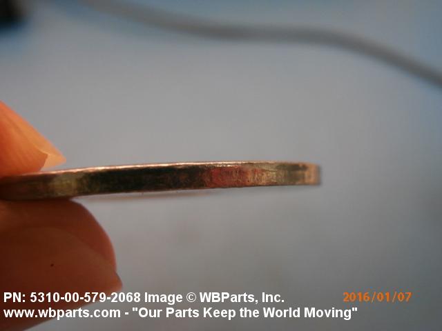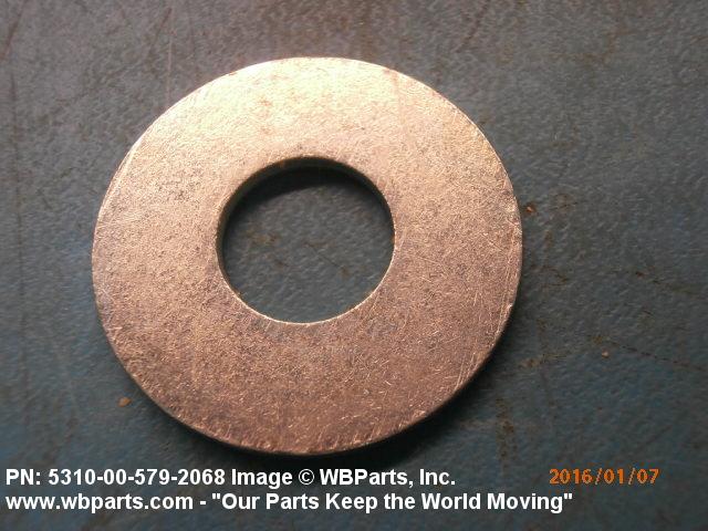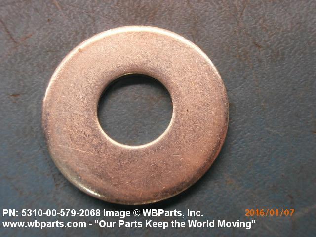 5310-00-579-2068 A washer having a centrally located hole with a solid or laminated cross-section and two flat parallel bearing surfaces. The hole must be 75 percent or less than the largest dimension and the bearing surface finish is greater than 32 microinch (0.8 micrometer). The thickness cannot exceed 25 percent of the largest outside dimension. When the largest outside dimension is less than 1/4 inch or 6mm, the thickness must be 0.006 inches (0.15mm) or greater and for items 1/4 inch (6mm) or larger, the thickness must be 0.016 inches (0.4mm) or greater. The maximum tolerance is applied to dimensions and used as a determining factor. Items with separable lamination use SHIM. For items fabricated from ceramic or electrically rated materials by specification or industry standards use INSULATOR (1), WASHER. Excludes DISK, VALVE, graphite impregnated and lubricated items.