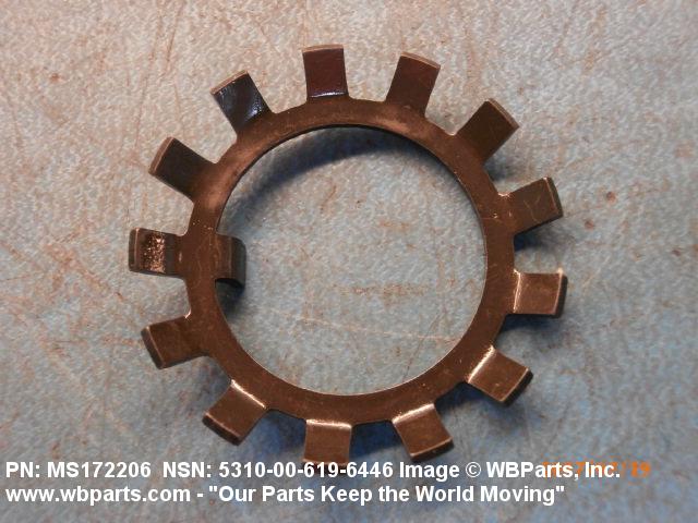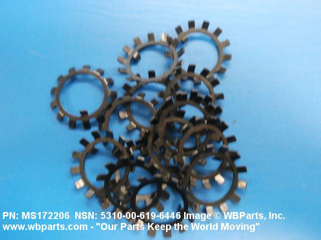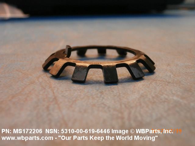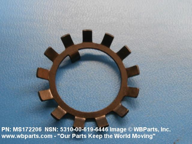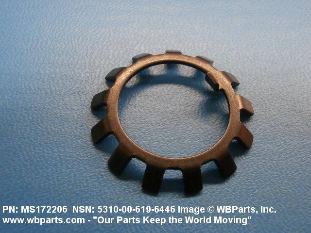 5310-00-619-6446 A washer of nonresilient material usually having two parallel bearing surfaces. The outside and/or inside edges have one or more protuberances. The ends and/or edges may be prebent at any angle or the protuberances may be prebent at any angle to the bearing surfaces. The keys or lugs may be fitted into keyways in adjacent material or they may be bent over after application to hold or lock one or more items in place. Excludes thrust type washer.