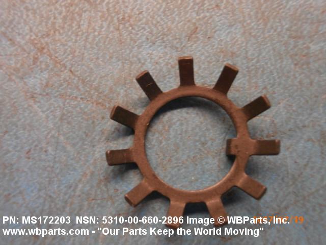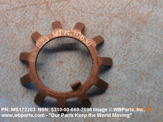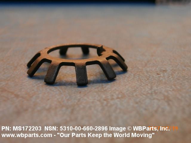 5310-00-660-2896 A washer of nonresilient material usually having two parallel bearing surfaces. The outside and/or inside edges have one or more protuberances. The ends and/or edges may be prebent at any angle or the protuberances may be prebent at any angle to the bearing surfaces. The keys or lugs may be fitted into keyways in adjacent material or they may be bent over after application to hold or lock one or more items in place. Excludes thrust type washer.