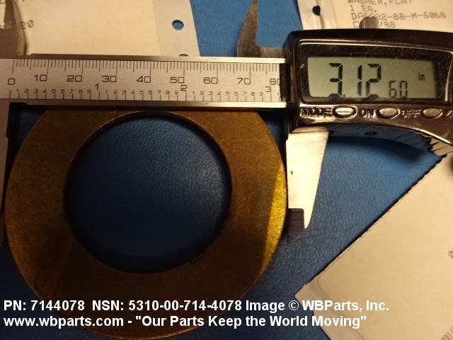 5310-00-714-4078 A washer having a centrally located hole with a solid or laminated cross-section and two flat parallel bearing surfaces. The hole must be 75 percent or less than the largest dimension and the bearing surface finish is greater than 32 microinch (0.8 micrometer). The thickness cannot exceed 25 percent of the largest outside dimension. When the largest outside dimension is less than 1/4 inch or 6mm, the thickness must be 0.006 inches (0.15mm) or greater and for items 1/4 inch (6mm) or larger, the thickness must be 0.016 inches (0.4mm) or greater. The maximum tolerance is applied to dimensions and used as a determining factor. Items with separable lamination use SHIM. For items fabricated from ceramic or electrically rated materials by specification or industry standards use INSULATOR (1), WASHER. Excludes DISK, VALVE, graphite impregnated and lubricated items.