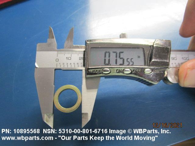 5310-00-801-6716 A washer having a centrally located hole with a solid or laminated cross-section and two flat parallel bearing surfaces. The hole must be 75 percent or less than the largest dimension and the bearing surface finish is greater than 32 microinch (0.8 micrometer). The thickness cannot exceed 25 percent of the largest outside dimension. When the largest outside dimension is less than 1/4 inch or 6mm, the thickness must be 0.006 inches (0.15mm) or greater and for items 1/4 inch (6mm) or larger, the thickness must be 0.016 inches (0.4mm) or greater. The maximum tolerance is applied to dimensions and used as a determining factor. Items with separable lamination use SHIM. For items fabricated from ceramic or electrically rated materials by specification or industry standards use INSULATOR (1), WASHER. Excludes DISK, VALVE, graphite impregnated and lubricated items.