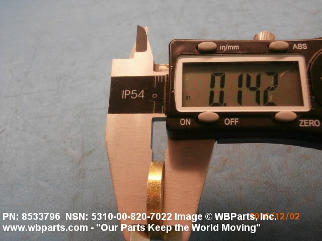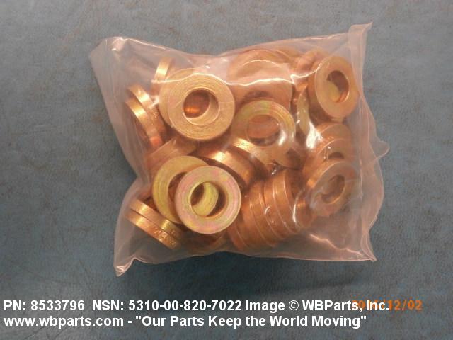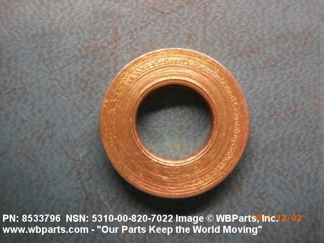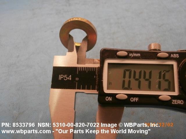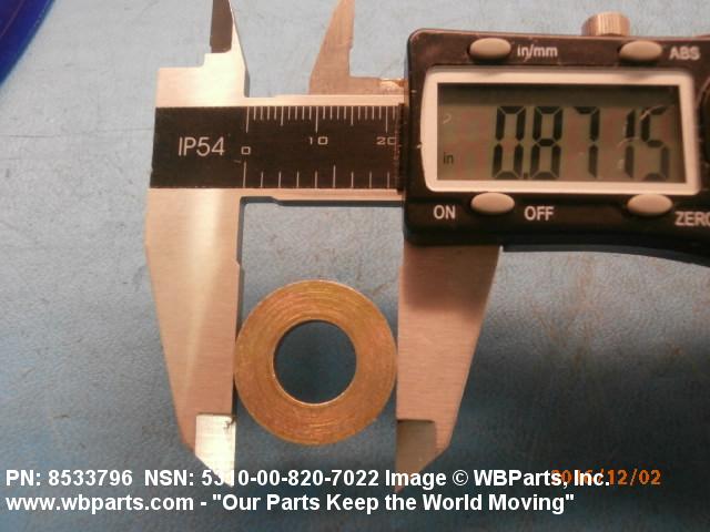5310-00-820-7022 A washer having a centrally located hole with a solid or laminated cross-section and two flat parallel bearing surfaces. The hole must be 75 percent or less than the largest dimension and the bearing surface finish is greater than 32 microinch (0.8 micrometer). The thickness cannot exceed 25 percent of the largest outside dimension. When the largest outside dimension is less than 1/4 inch or 6mm, the thickness must be 0.006 inches (0.15mm) or greater and for items 1/4 inch (6mm) or larger, the thickness must be 0.016 inches (0.4mm) or greater. The maximum tolerance is applied to dimensions and used as a determining factor. Items with separable lamination use SHIM. For items fabricated from ceramic or electrically rated materials by specification or industry standards use INSULATOR (1), WASHER. Excludes DISK, VALVE, graphite impregnated and lubricated items.