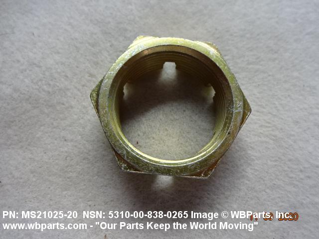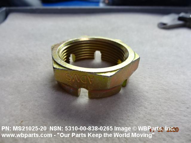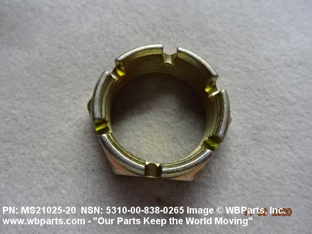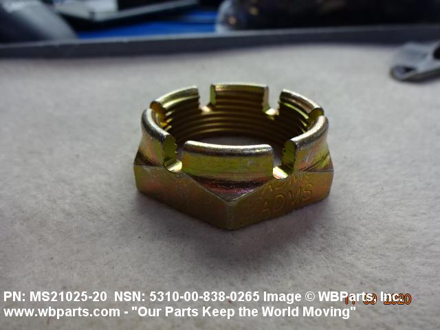 5310-00-838-0265 A nut having 6 flat sides, flat on the bottom and having a slotted cylindrical or dome shaped upper portion. It is designed to provide positive locking when used with a solid or split (cotter) pin. Excludes NUT (1), PLAIN, SLOTTED, HEXAGON.