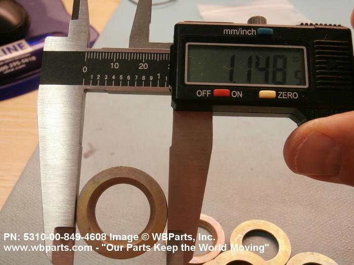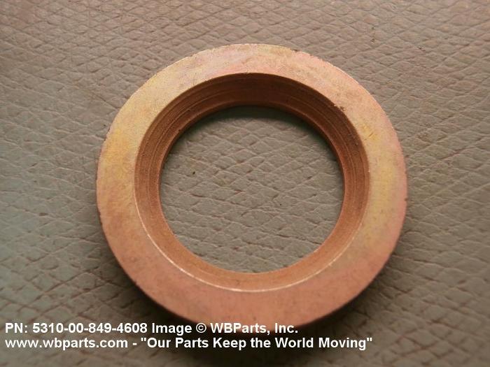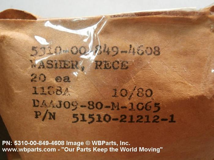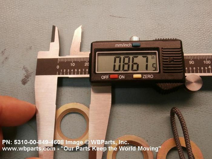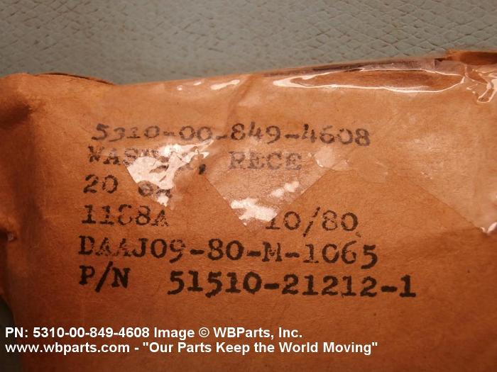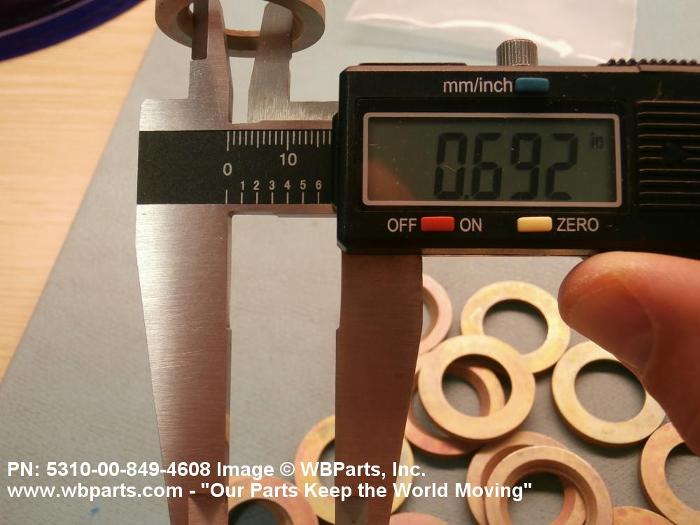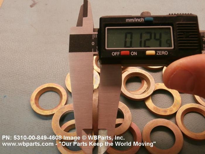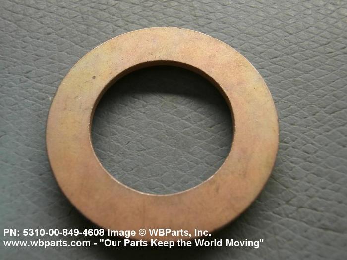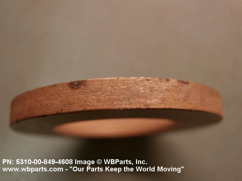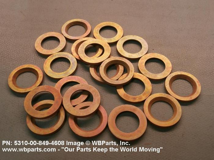5310-00-849-4608 A washer of any peripheral shape having a centrally located hole. Both bearing surfaces are parallel and flat, but one or both of the bearing surfaces must be broken by a counterbore, countersink, or similarly shaped recess. The thickness must not exceed 25 per cent of the outside diameter or the largest outside dimension. The maximum limit of the tolerance or range applied to the thickness and/or largest outside dimension must be used to determine compliance. Excludes WASHER, CONCAVE, RETAINER, PACKING, and thrust type washers. See also SPACER, SLEEVE; and SPACER, STEPPED.