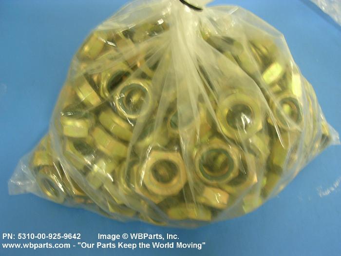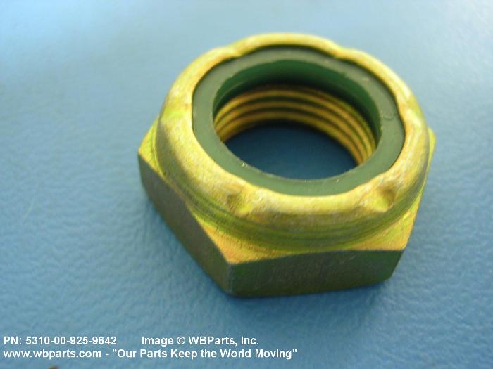 5310-00-925-9642 A nut having a flat bottom and 6 sides. An integral feature is incorporated for locking on the threads of a mating member. Excludes NUT (1), SELF-LOCKING, CAP.