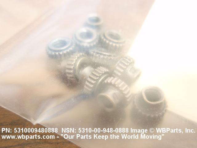 5310-00-948-0888 A nut having a sleeve portion on its under side, which can be crimped or clinched to hold the item in place when inserted in a hole. An integral feature is incorporated for locking.