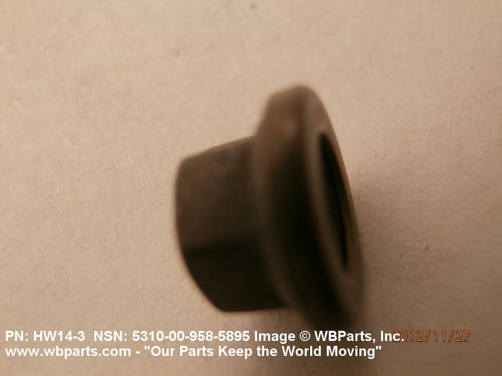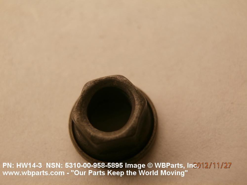 5310-00-958-5895 A nut having 6 flat sides and an integral washer which extends beyond the flats or periphery. An integral feature is incorporated for locking on the threads of a mating member.