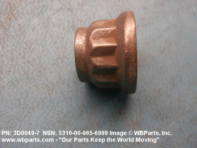 5310-00-965-6998 A nut having 12 drive points, 24 sides, and an integral washer which extends beyond the points or periphery. An integral feature is incorporated for locking on the threads of a mating member.