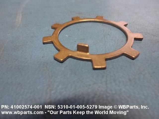5310-01-005-5279 A washer of nonresilient material usually having two parallel bearing surfaces. The outside and/or inside edges have one or more protuberances. The ends and/or edges may be prebent at any angle or the protuberances may be prebent at any angle to the bearing surfaces. The keys or lugs may be fitted into keyways in adjacent material or they may be bent over after application to hold or lock one or more items in place. Excludes thrust type washer.