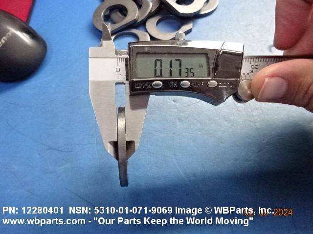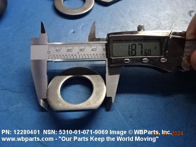 5310-01-071-9069 A washer having a centrally located hole with a solid or laminated cross-section and two flat parallel bearing surfaces. The hole must be 75 percent or less than the largest dimension and the bearing surface finish is greater than 32 microinch (0.8 micrometer). The thickness cannot exceed 25 percent of the largest outside dimension. When the largest outside dimension is less than 1/4 inch or 6mm, the thickness must be 0.006 inches (0.15mm) or greater and for items 1/4 inch (6mm) or larger, the thickness must be 0.016 inches (0.4mm) or greater. The maximum tolerance is applied to dimensions and used as a determining factor. Items with separable lamination use SHIM. For items fabricated from ceramic or electrically rated materials by specification or industry standards use INSULATOR (1), WASHER. Excludes DISK, VALVE, graphite impregnated and lubricated items.