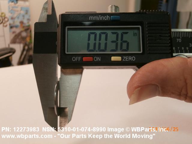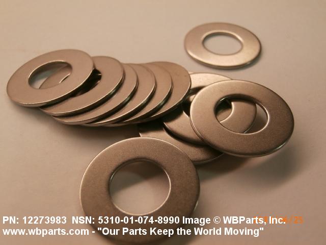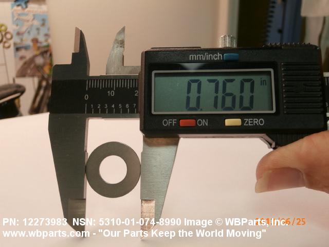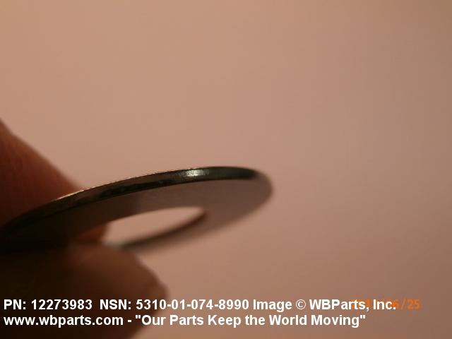5310-01-074-8990 A washer having a centrally located hole with a solid or laminated cross-section and two flat parallel bearing surfaces. The hole must be 75 percent or less than the largest dimension and the bearing surface finish is greater than 32 microinch (0.8 micrometer). The thickness cannot exceed 25 percent of the largest outside dimension. When the largest outside dimension is less than 1/4 inch or 6mm, the thickness must be 0.006 inches (0.15mm) or greater and for items 1/4 inch (6mm) or larger, the thickness must be 0.016 inches (0.4mm) or greater. The maximum tolerance is applied to dimensions and used as a determining factor. Items with separable lamination use SHIM. For items fabricated from ceramic or electrically rated materials by specification or industry standards use INSULATOR (1), WASHER. Excludes DISK, VALVE, graphite impregnated and lubricated items.