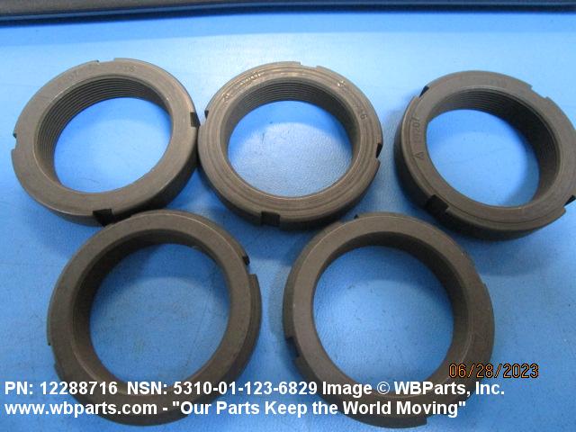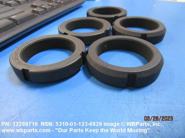 5310-01-123-6829 A nut, circular in shape, which may have wrenching facilities such as flats, holes, protrusions, slots or splines in or on the periphery or in the face opposite the bearing surface. For items having a thickness (or height) exceeding two times the outside diameter, use POST, ELECTRICAL-MECHANICAL EQUIPMENT. See also NUT (1), PLAIN, KNURLED. (When height or thickness and/or outside diameter is designated as a tolerance dimension, the maximum dimension will be used to determine compliance.