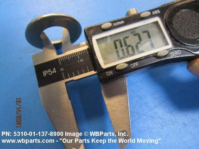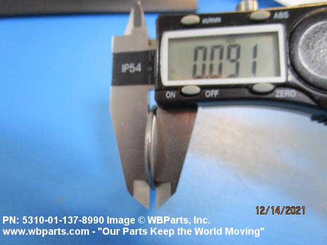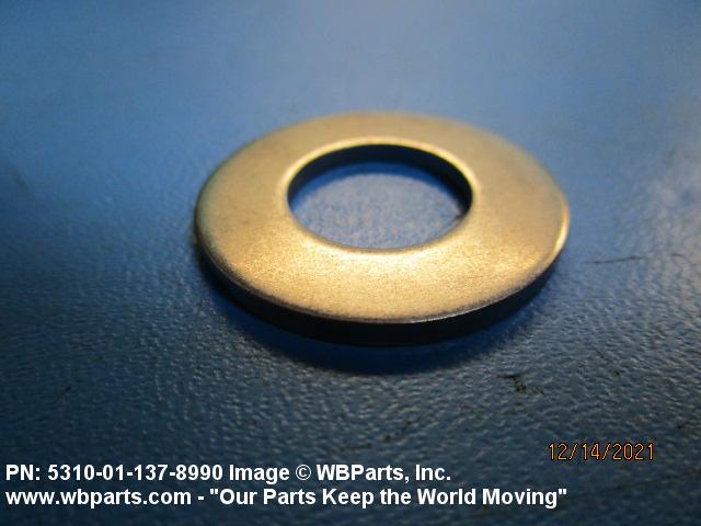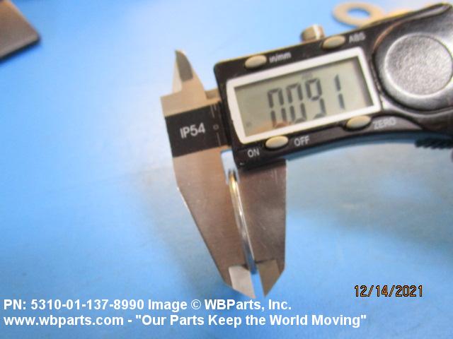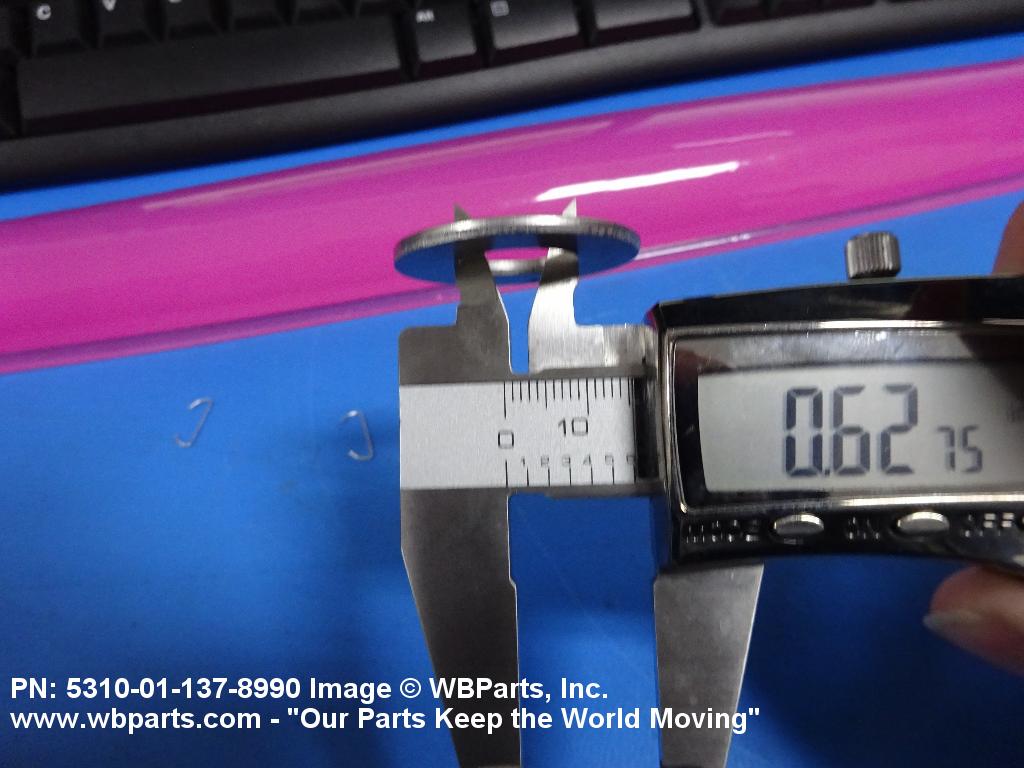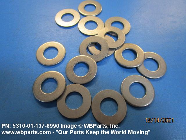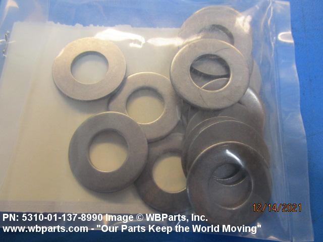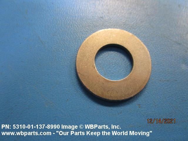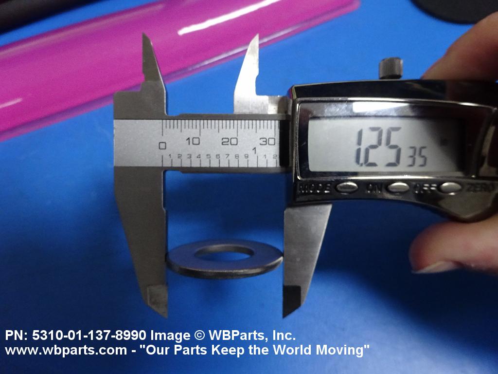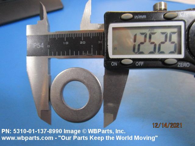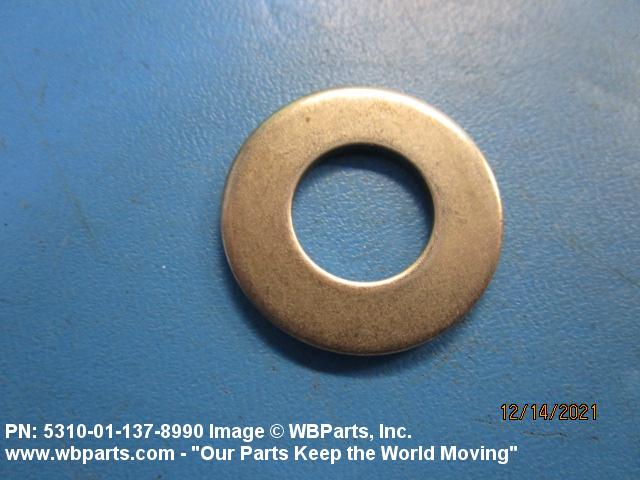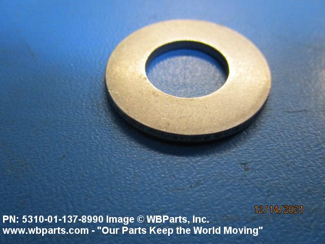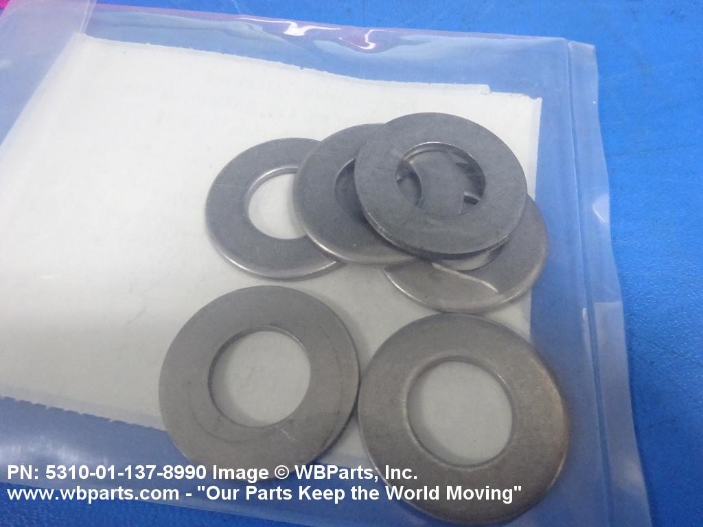 5310-01-137-8990 A washer having a centrally located hole with a solid or laminated cross-section and two flat parallel bearing surfaces. The hole must be 75 percent or less than the largest dimension and the bearing surface finish is greater than 32 microinch (0.8 micrometer). The thickness cannot exceed 25 percent of the largest outside dimension. When the largest outside dimension is less than 1/4 inch or 6mm, the thickness must be 0.006 inches (0.15mm) or greater and for items 1/4 inch (6mm) or larger, the thickness must be 0.016 inches (0.4mm) or greater. The maximum tolerance is applied to dimensions and used as a determining factor. Items with separable lamination use SHIM. For items fabricated from ceramic or electrically rated materials by specification or industry standards use INSULATOR (1), WASHER. Excludes DISK, VALVE, graphite impregnated and lubricated items.