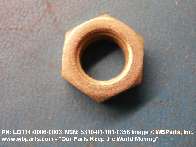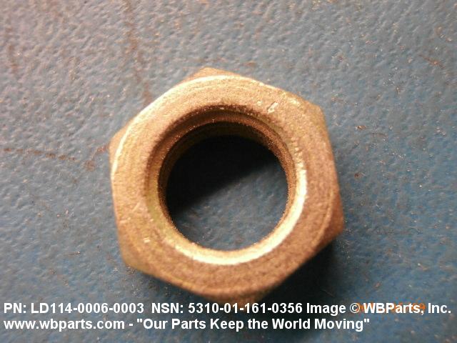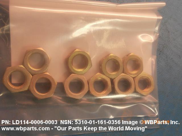 5310-01-161-0356 A nut, flat on top and bottom having 6 flat sides. For items which have internal tapered or straight (parallel) pipe threads, specific electrical conduit size designation, and which when installed, provide a method of tightening to lock the connection, see LOCKNUT, ELECTRICAL CONDUIT. See also LOCKNUT, TUBE FITTING. For items having a thickness (or height) exceeding two times the width across the flats, use POST, ELECTRICAL-MECHANICAL EQUIPMENT. (When height or thickness and/or width across the flats is designated as a tolerance dimension, the maximum dimension will be used to determine compliance.