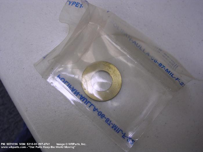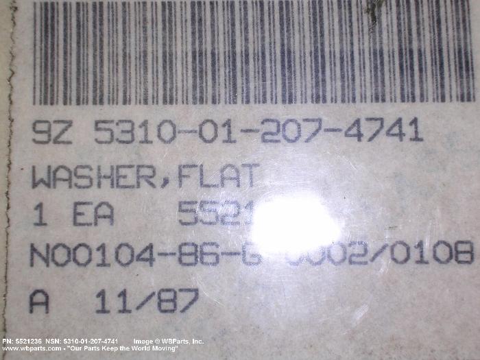 5310-01-207-4741 A washer having a centrally located hole with a solid or laminated cross-section and two flat parallel bearing surfaces. The hole must be 75 percent or less than the largest dimension and the bearing surface finish is greater than 32 microinch (0.8 micrometer). The thickness cannot exceed 25 percent of the largest outside dimension. When the largest outside dimension is less than 1/4 inch or 6mm, the thickness must be 0.006 inches (0.15mm) or greater and for items 1/4 inch (6mm) or larger, the thickness must be 0.016 inches (0.4mm) or greater. The maximum tolerance is applied to dimensions and used as a determining factor. Items with separable lamination use SHIM. For items fabricated from ceramic or electrically rated materials by specification or industry standards use INSULATOR (1), WASHER. Excludes DISK, VALVE, graphite impregnated and lubricated items.