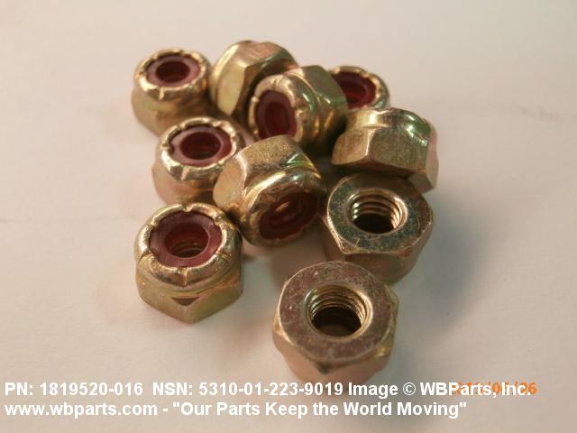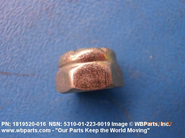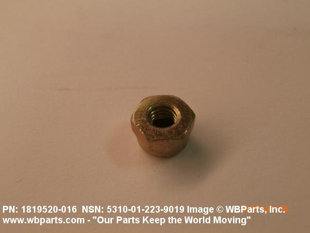 5310-01-223-9019 A nut having a flat bottom and 6 sides. An integral feature is incorporated for locking on the threads of a mating member. Excludes NUT (1), SELF-LOCKING, CAP.
