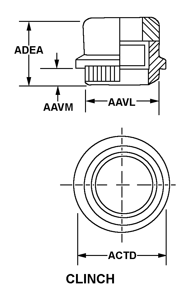 5310-01-285-1720 A nut having a sleeve portion on its under side, which can be crimped or clinched to hold the item in place when inserted in a hole. An integral feature is incorporated for locking.