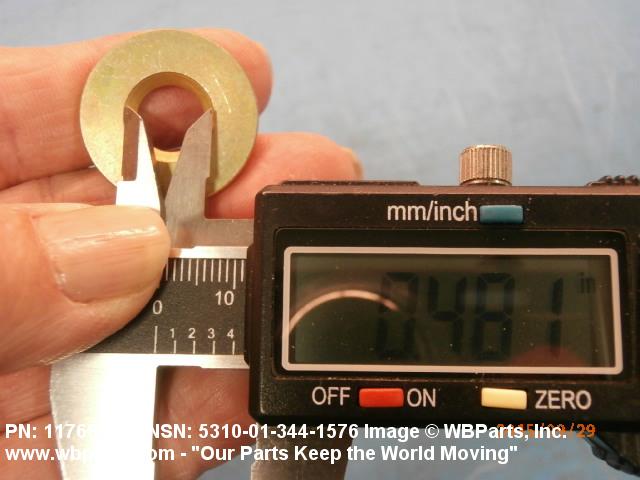 5310-01-344-1576 A washer having a centrally located hole with a solid or laminated cross-section and two flat parallel bearing surfaces. The hole must be 75 percent or less than the largest dimension and the bearing surface finish is greater than 32 microinch (0.8 micrometer). The thickness cannot exceed 25 percent of the largest outside dimension. When the largest outside dimension is less than 1/4 inch or 6mm, the thickness must be 0.006 inches (0.15mm) or greater and for items 1/4 inch (6mm) or larger, the thickness must be 0.016 inches (0.4mm) or greater. The maximum tolerance is applied to dimensions and used as a determining factor. Items with separable lamination use SHIM. For items fabricated from ceramic or electrically rated materials by specification or industry standards use INSULATOR (1), WASHER. Excludes DISK, VALVE, graphite impregnated and lubricated items.