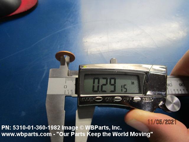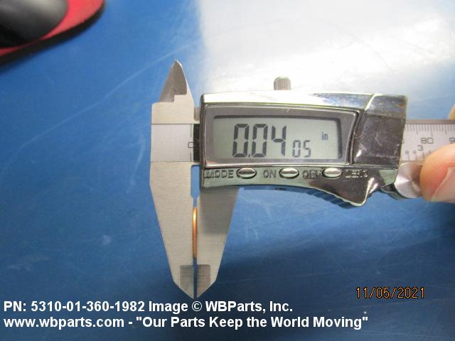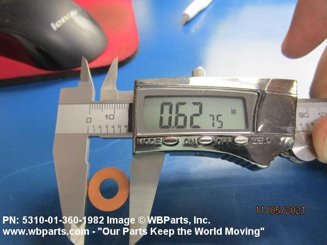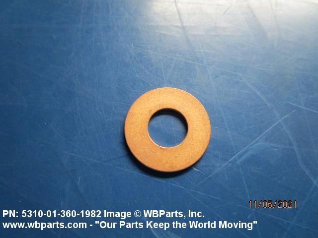 5310-01-360-1982 A washer having a centrally located hole with a solid or laminated cross-section and two flat parallel bearing surfaces. The hole must be 75 percent or less than the largest dimension and the bearing surface finish is greater than 32 microinch (0.8 micrometer). The thickness cannot exceed 25 percent of the largest outside dimension. When the largest outside dimension is less than 1/4 inch or 6mm, the thickness must be 0.006 inches (0.15mm) or greater and for items 1/4 inch (6mm) or larger, the thickness must be 0.016 inches (0.4mm) or greater. The maximum tolerance is applied to dimensions and used as a determining factor. Items with separable lamination use SHIM. For items fabricated from ceramic or electrically rated materials by specification or industry standards use INSULATOR (1), WASHER. Excludes DISK, VALVE, graphite impregnated and lubricated items.