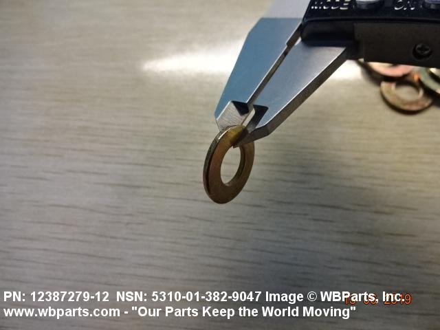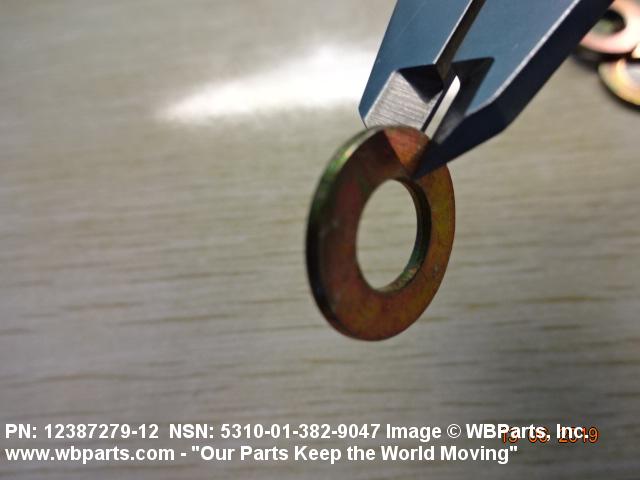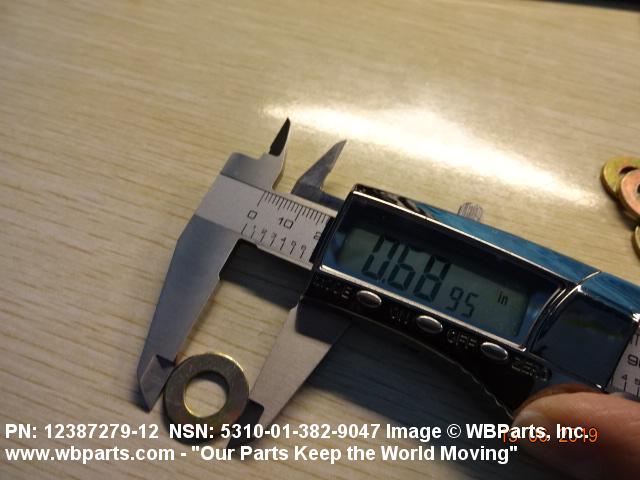 5310-01-382-9047 A washer having a centrally located hole with a solid or laminated cross-section and two flat parallel bearing surfaces. The hole must be 75 percent or less than the largest dimension and the bearing surface finish is greater than 32 microinch (0.8 micrometer). The thickness cannot exceed 25 percent of the largest outside dimension. When the largest outside dimension is less than 1/4 inch or 6mm, the thickness must be 0.006 inches (0.15mm) or greater and for items 1/4 inch (6mm) or larger, the thickness must be 0.016 inches (0.4mm) or greater. The maximum tolerance is applied to dimensions and used as a determining factor. Items with separable lamination use SHIM. For items fabricated from ceramic or electrically rated materials by specification or industry standards use INSULATOR (1), WASHER. Excludes DISK, VALVE, graphite impregnated and lubricated items.