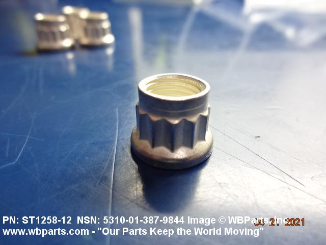 5310-01-387-9844 A nut having 12 drive points, 24 sides, and an integral washer which extends beyond the points or periphery. An integral feature is incorporated for locking on the threads of a mating member.
