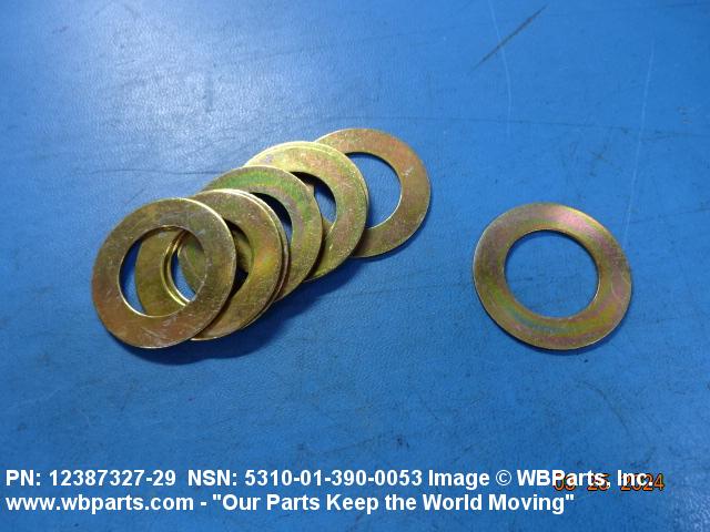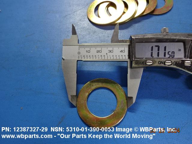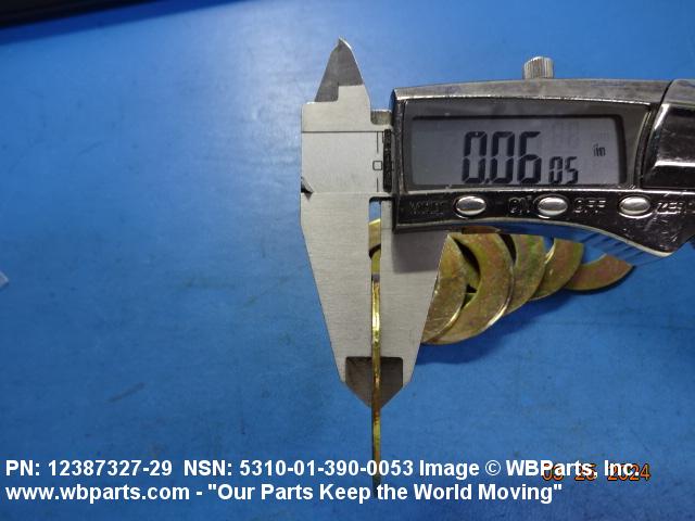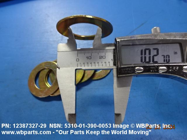 5310-01-390-0053 A washer having a centrally located hole with a solid or laminated cross-section and two flat parallel bearing surfaces. The hole must be 75 percent or less than the largest dimension and the bearing surface finish is greater than 32 microinch (0.8 micrometer). The thickness cannot exceed 25 percent of the largest outside dimension. When the largest outside dimension is less than 1/4 inch or 6mm, the thickness must be 0.006 inches (0.15mm) or greater and for items 1/4 inch (6mm) or larger, the thickness must be 0.016 inches (0.4mm) or greater. The maximum tolerance is applied to dimensions and used as a determining factor. Items with separable lamination use SHIM. For items fabricated from ceramic or electrically rated materials by specification or industry standards use INSULATOR (1), WASHER. Excludes DISK, VALVE, graphite impregnated and lubricated items.