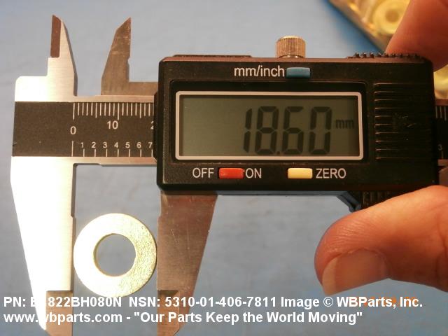 5310-01-406-7811 A washer having a centrally located hole with a solid or laminated cross-section and two flat parallel bearing surfaces. The hole must be 75 percent or less than the largest dimension and the bearing surface finish is greater than 32 microinch (0.8 micrometer). The thickness cannot exceed 25 percent of the largest outside dimension. When the largest outside dimension is less than 1/4 inch or 6mm, the thickness must be 0.006 inches (0.15mm) or greater and for items 1/4 inch (6mm) or larger, the thickness must be 0.016 inches (0.4mm) or greater. The maximum tolerance is applied to dimensions and used as a determining factor. Items with separable lamination use SHIM. For items fabricated from ceramic or electrically rated materials by specification or industry standards use INSULATOR (1), WASHER. Excludes DISK, VALVE, graphite impregnated and lubricated items.