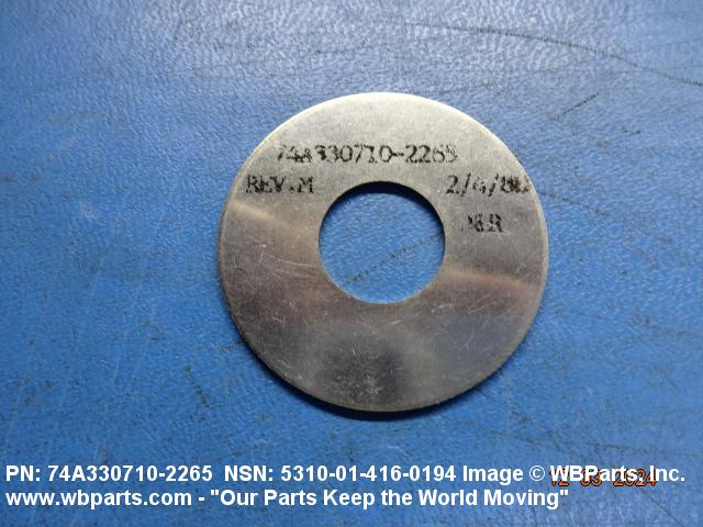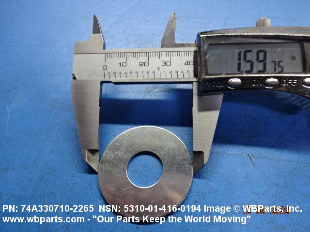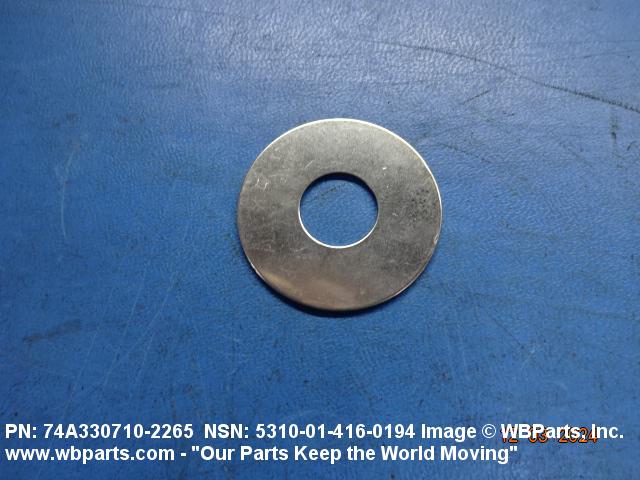 5310-01-416-0194 A washer having a centrally located hole with a solid or laminated cross-section and two flat parallel bearing surfaces. The hole must be 75 percent or less than the largest dimension and the bearing surface finish is greater than 32 microinch (0.8 micrometer). The thickness cannot exceed 25 percent of the largest outside dimension. When the largest outside dimension is less than 1/4 inch or 6mm, the thickness must be 0.006 inches (0.15mm) or greater and for items 1/4 inch (6mm) or larger, the thickness must be 0.016 inches (0.4mm) or greater. The maximum tolerance is applied to dimensions and used as a determining factor. Items with separable lamination use SHIM. For items fabricated from ceramic or electrically rated materials by specification or industry standards use INSULATOR (1), WASHER. Excludes DISK, VALVE, graphite impregnated and lubricated items.