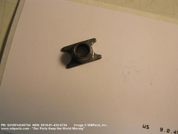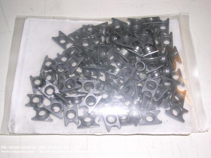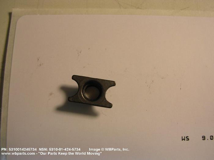 5310-01-424-5734 A nut having ears or lugs designed to hold it in position after its installation in a specially designed channel. An integral feature is incorporated for locking on the threads of a mating member.